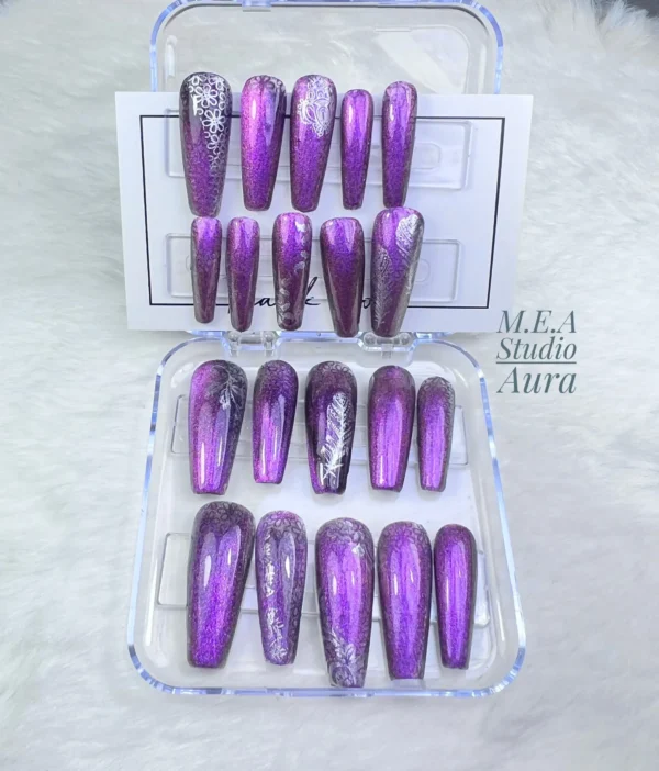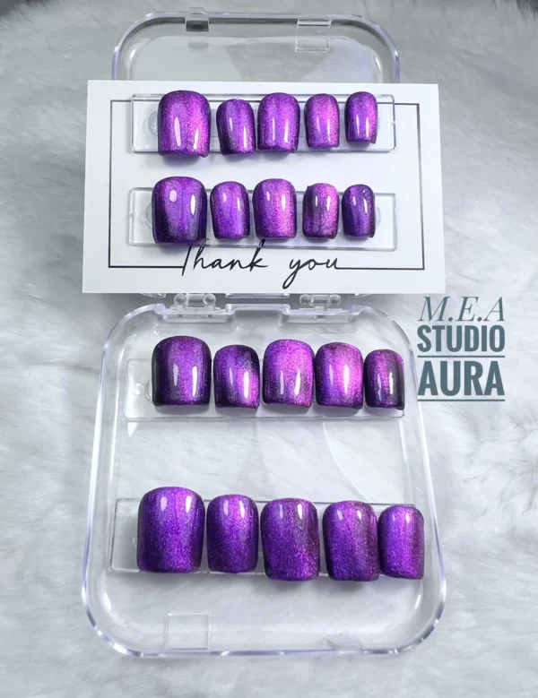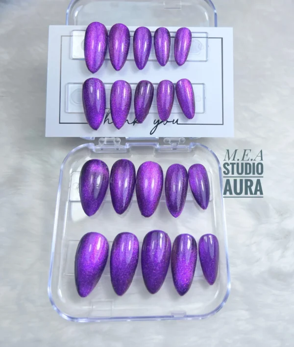 - Élégance et profondeur Succombez à l’élégance de ce violet intense, pour une manucure chic et captivante. Le vernis Cat Eyes crée un effet lumineux et hypnotique qui capte la lumière à chaque mouvement. Chaque capsule est conçue pour sublimer vos mains avec sophistication et modernité. Longueur et Forme - Style : Medium- Forme : Coffin / Amande (selon variante) Design et Techniques - Couleurs : Violet intense - Détail fun : Effet lumineux Cat Eyes - Technique : Dessin artisanal