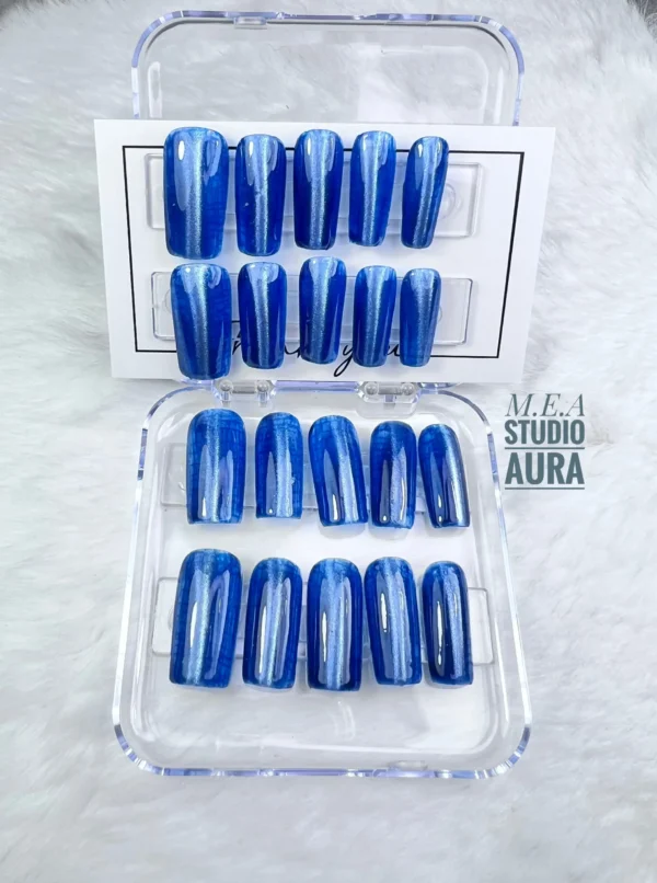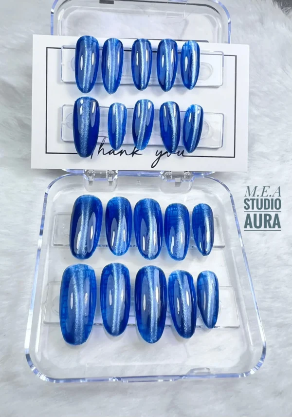 - L’élégance féline au bout des doigts Plongez vos mains dans une profondeur mystique avec Magnétisme Bleu, une collection aux reflets chatoyants inspirée du regard félin. Chaque capsule révèle un effet Cat Eyes bleu intense, structuré par un trait lumineux central, obtenu par la technique de gel aimanté. Un jeu de lumière élégant, vivant, qui capte les regards et sublime chaque mouvement de vos mains. Longueur et Forme - Style : Amande Medium - Forme : Élancée et raffinée pour sublimer la main Design et Techniques - Couleur : Bleu profond avec reflets changeants - Effet visuel : Trait lumineux central…