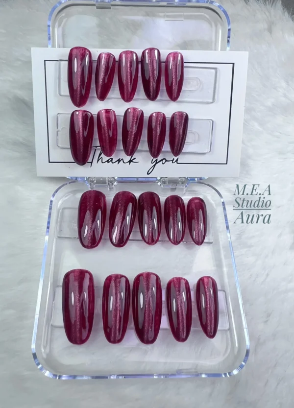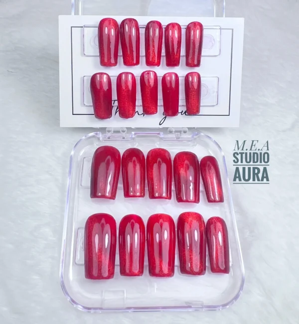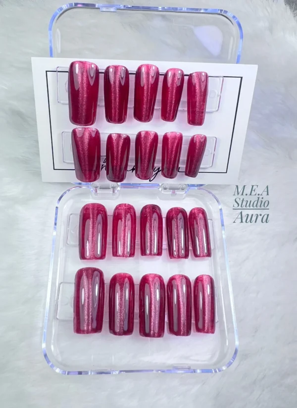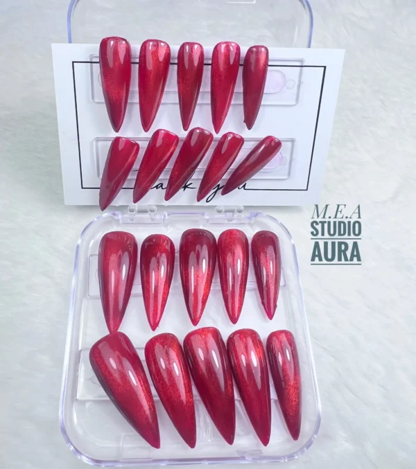 - L’élégance féline au bout des doigts Plongez vos mains dans une profondeur mystique avec Magnétisme Rouge, une collection aux reflets chatoyants inspirée du regard félin. Chaque capsule révèle un effet Cat Eyes rouge intense, structuré par un trait lumineux central, obtenu par la technique de gel aimanté. Un jeu de lumière élégant, vivant, qui capte les regards et sublime chaque mouvement de vos mains. Longueur et Forme - Style : Amande Medium - Forme : Élancée et raffinée pour sublimer la main Design et Techniques - Couleur : Rouge profond avec reflets changeants - Effet visuel : Trait lumineux central…
