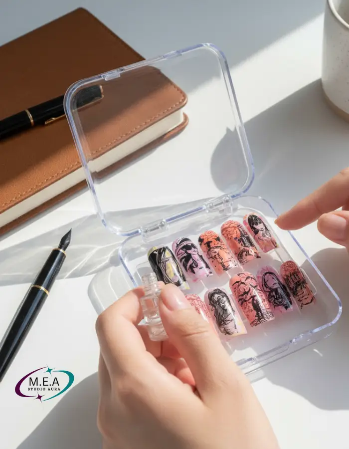 Laissez vos ongles raconter des histoires au bord du jour. Avec Éclats d’Aube, chaque capsule devient un fragment d’émotion : silhouettes de visages, instants sous la pluie, chemins forestiers baignés d’un éclat orangé doux et diffus. Réalisés en feutres à alcool dans un effet aquarelle maîtrisé, les fonds offrent une texture visuelle chaleureuse et nuancée, tandis que les motifs en stamping noir créent un contraste artistique saisissant.