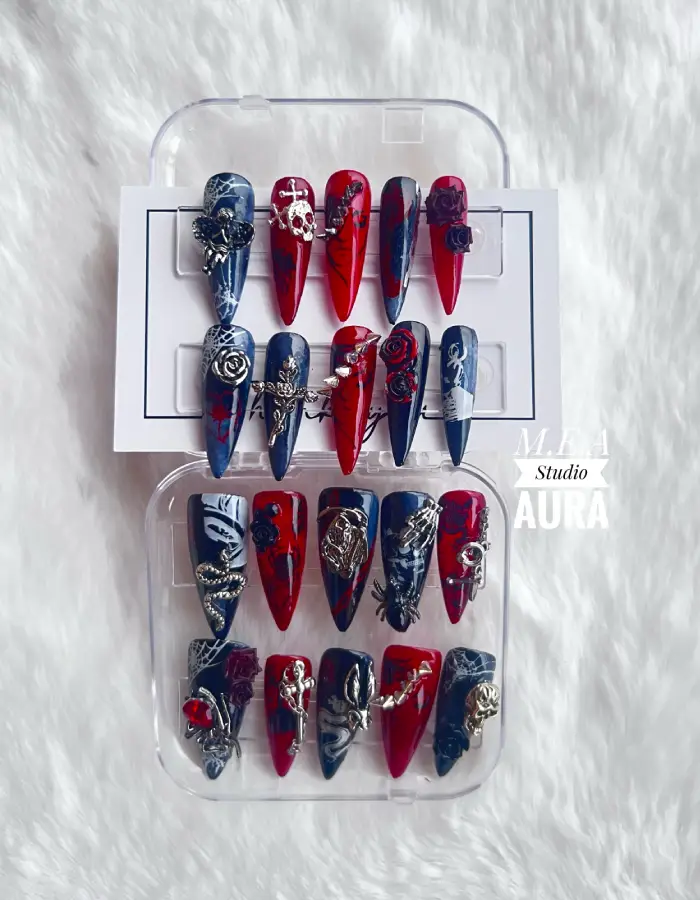 Chaque capsule est réalisée à la main comme une pièce rituelle. Le contraste noir et blanc structure le design, tandis que les reflets rouges au blooming gel semblent se diffuser comme une énergie vivante sous la surface. Les bijoux gothiques viennent parfaire l’ensemble pour une manucure intense, théâtrale et profondément expressive.