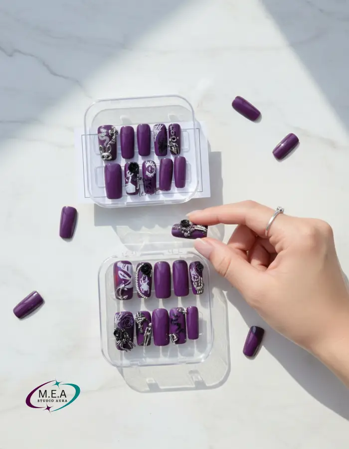 Chaque capsule est réalisée à la main pour offrir une manucure gothique au caractère fort et sophistiqué. Le carré medium apporte structure et modernité, tandis que le prune intense et les ornements symboliques créent une esthétique sombre, élégante et assumée.