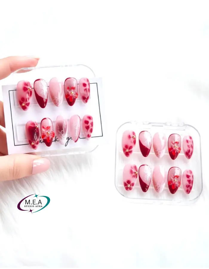 Chaque capsule est travaillée avec soin afin d’offrir une manucure douce et élégante. La base nude et la french structurent l’ongle, tandis que les fleurs prune apportent une touche florale sophistiquée. Les nuages marron, délicatement fondus sur certaines press-on, créent un effet subtil et chaleureux, pour une manucure raffinée et originale.