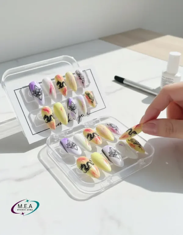 – Technique : Vernis press-on unicolore, lisse et lumineux
