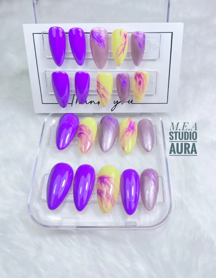 Laissez-vous emporter par la magie des couleurs avec ce set de press on nails medium amande. Chaque capsule présente un dégradé subtil violet et jaune, travaillé au blooming gel, avec des touches de violet doré et reflets violet foncé pour un rendu lumineux et raffiné.