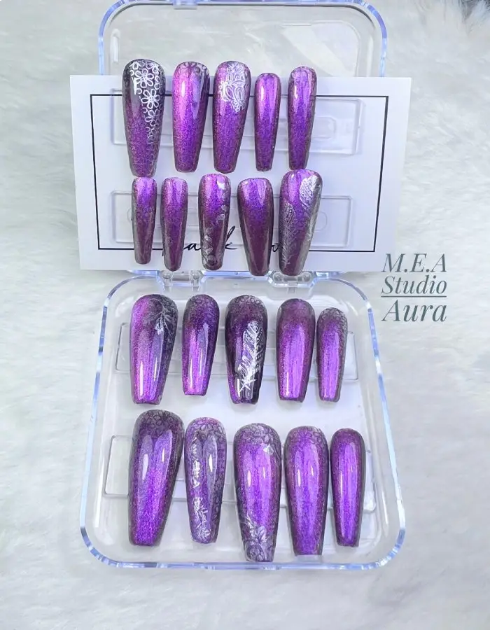 – Motifs & techniques : Yeux de chat hypnotiques en stamping reverse, détails sous capsules
