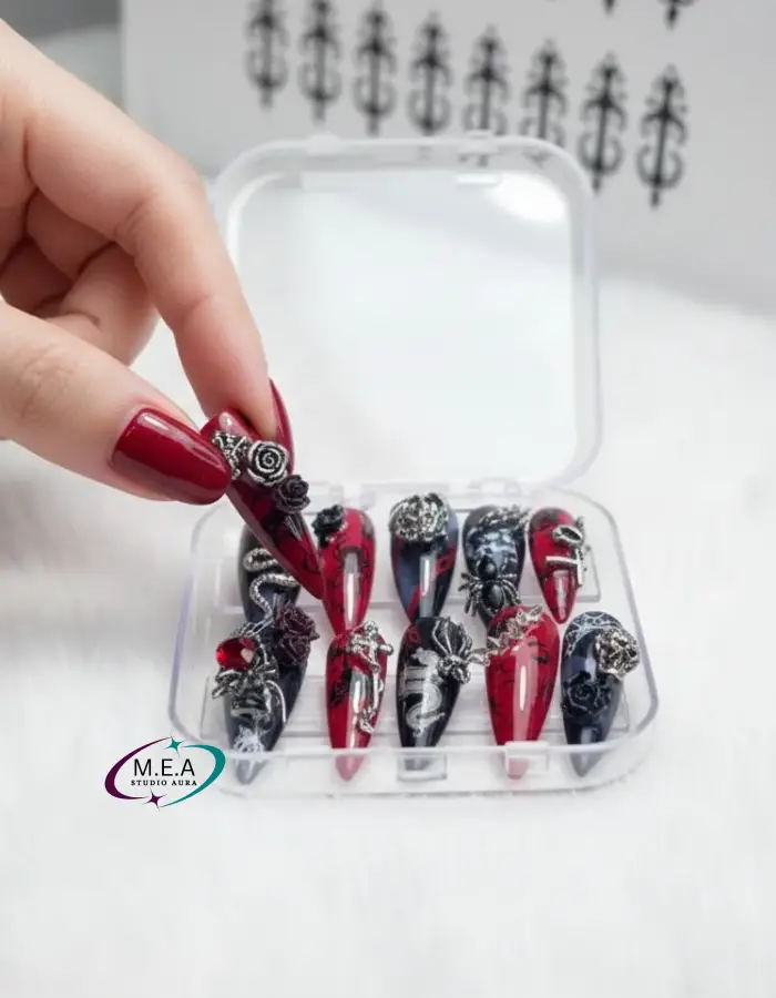 Une manucure gothique contrastée en noir et rouge , avec motifs détaillés et bijoux gothiques assortis pour un look sombre et captivant.