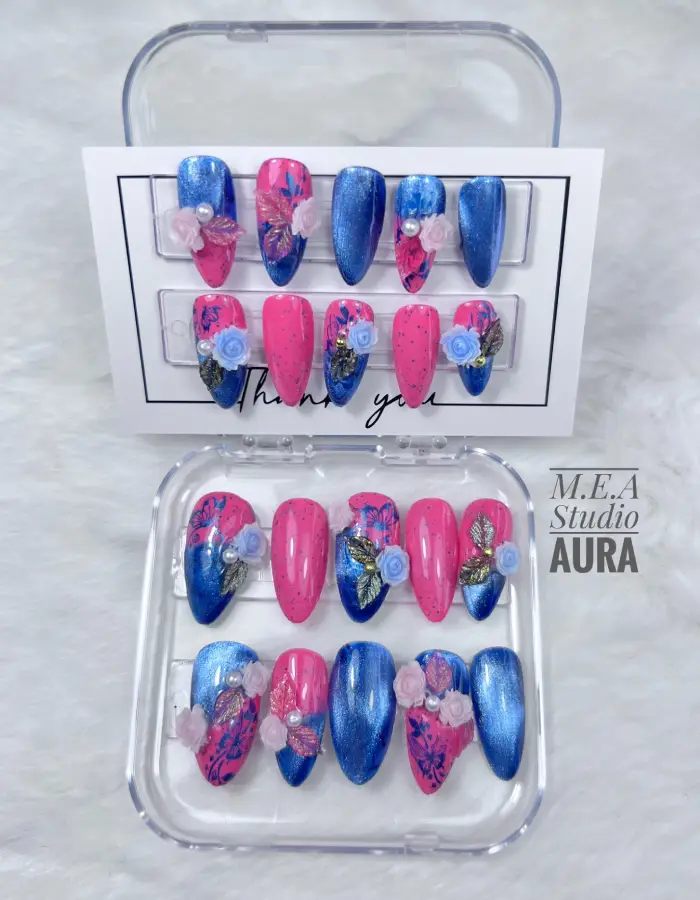 Un design mêlant rose pastel, bleu cat eyes profond et décorations florales délicates. Un look doux, moderne et lumineux.