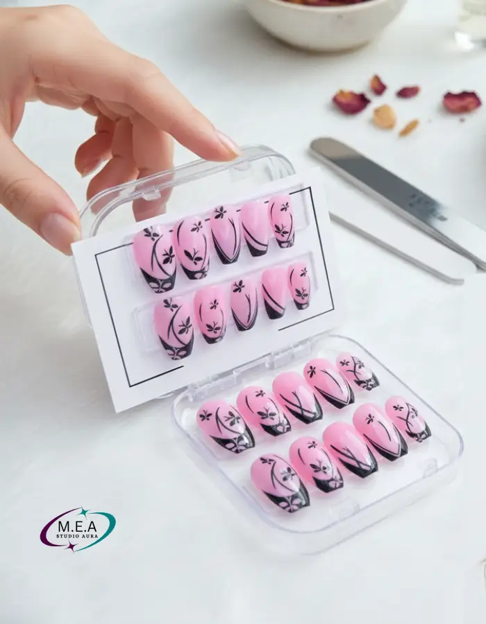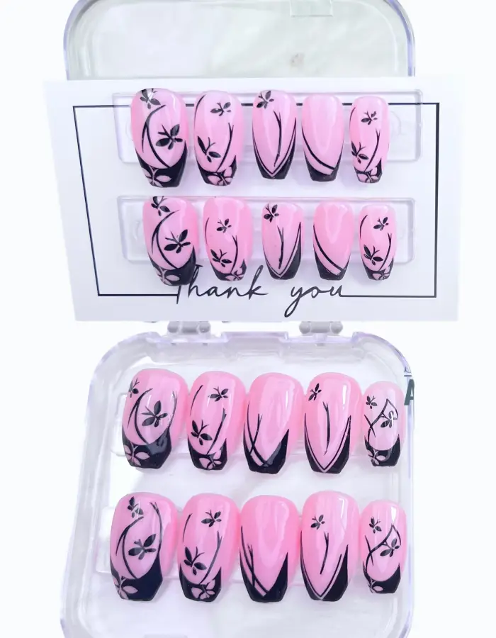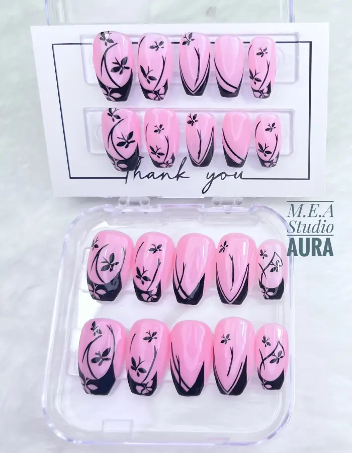 Succombez à la délicatesse de ce rose lumineux, sublimé par un stamping French noir et de petites fleurs noires raffinées. Chaque détail a été travaillé avec soin pour un rendu élégant et sophistiqué. La forme courte coffin carré apporte modernité et confort au quotidien.