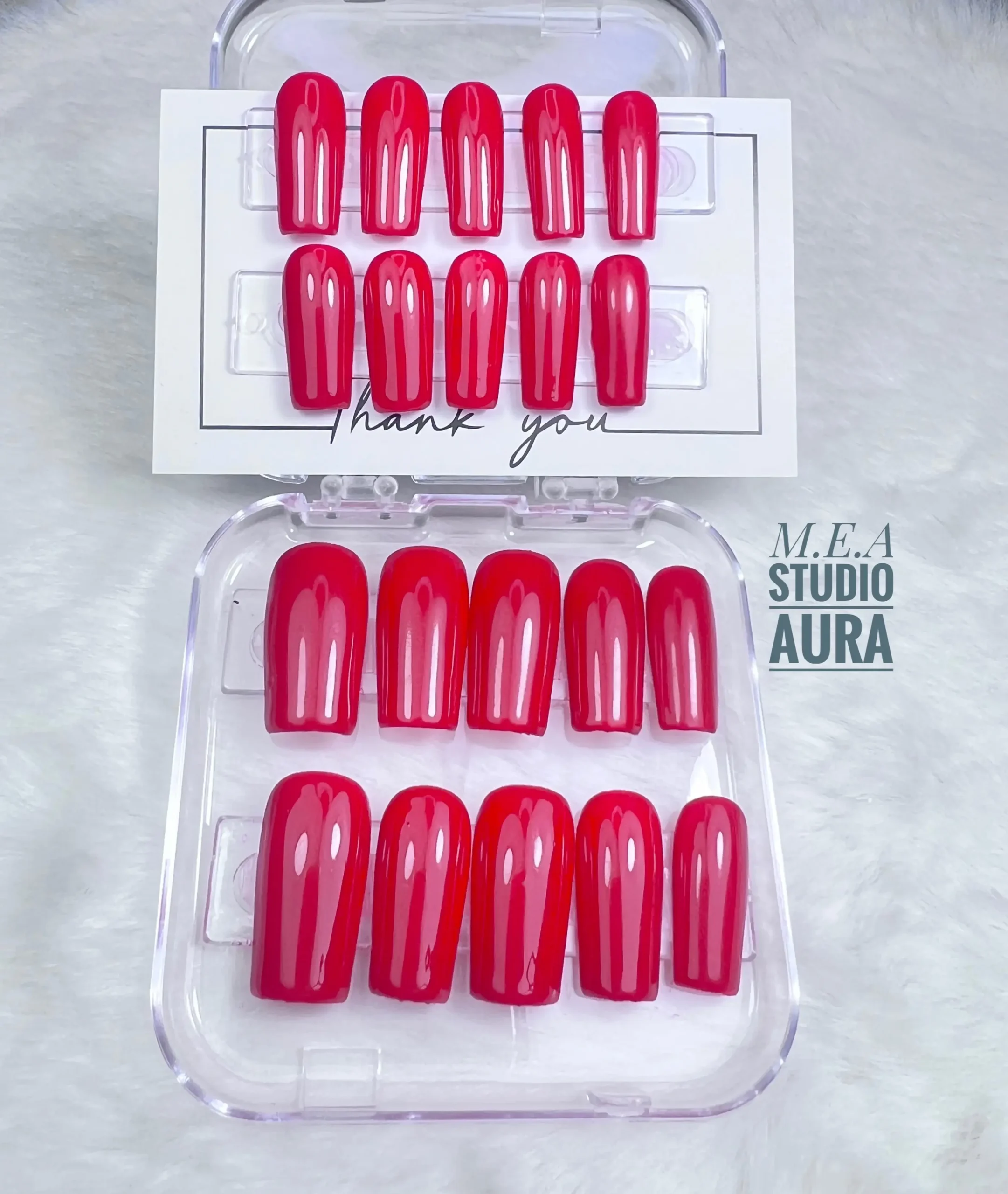 Ce set de press on nails au fini brillant apporte un style sobre et universel, adapté aussi bien aux looks quotidiens qu’aux grandes occasions. L’intensité pure d’un rouge intemporel sublime vos mains avec élégance.