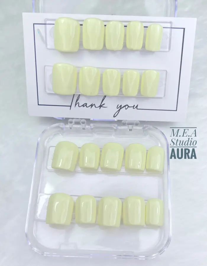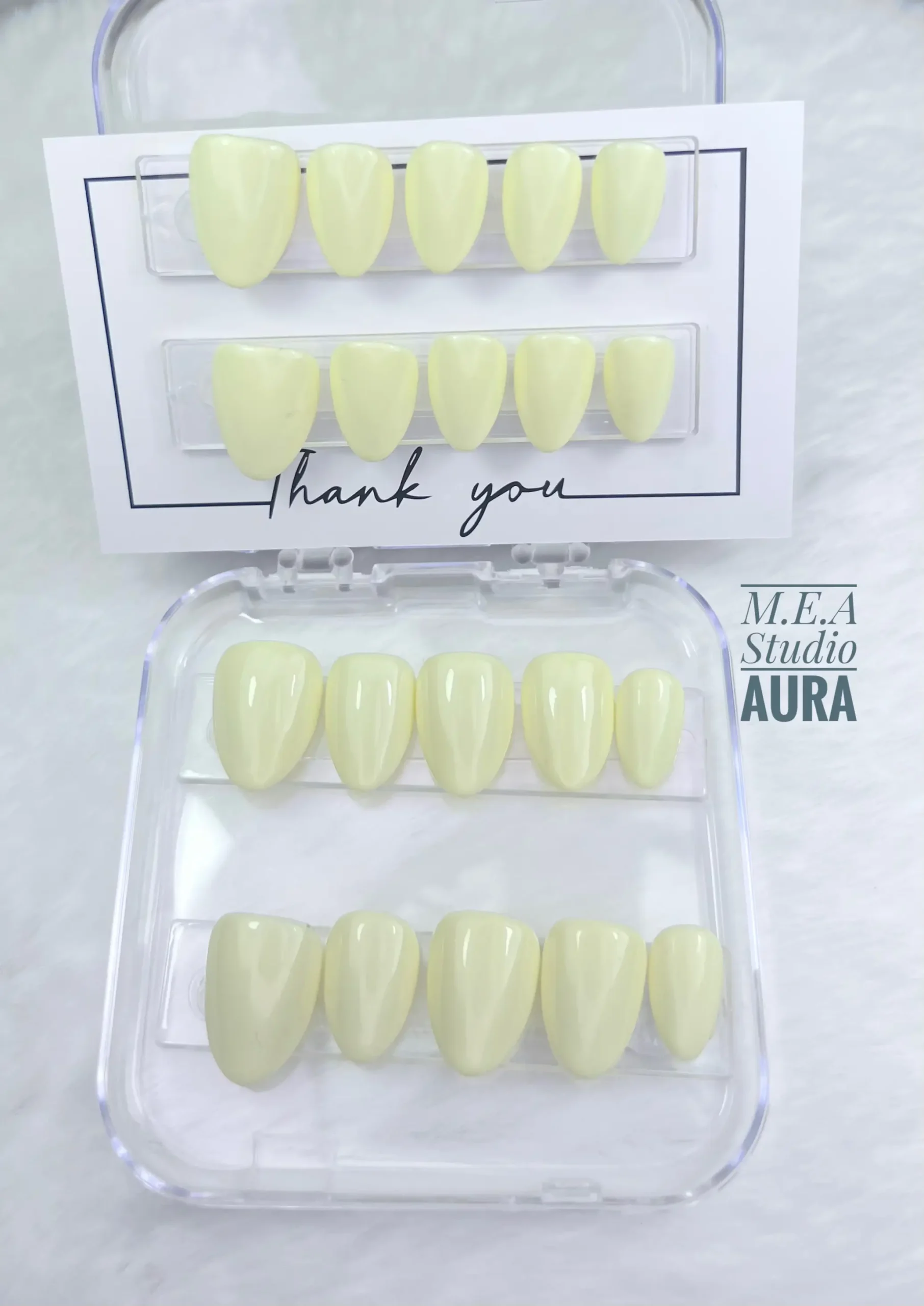 Ce set de press on nails unis se décline en deux formes amande pour s’adapter à tous les styles et toutes les occasions. La douceur et la vitalité d’un jaune lumineux illumine vos mains et apporte une touche joyeuse à chaque geste.